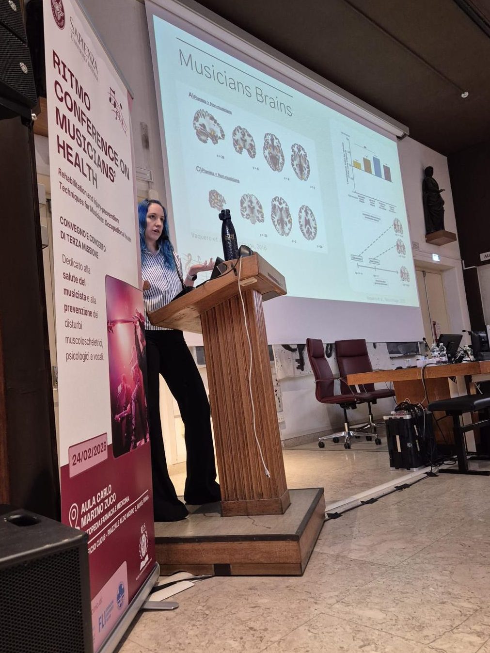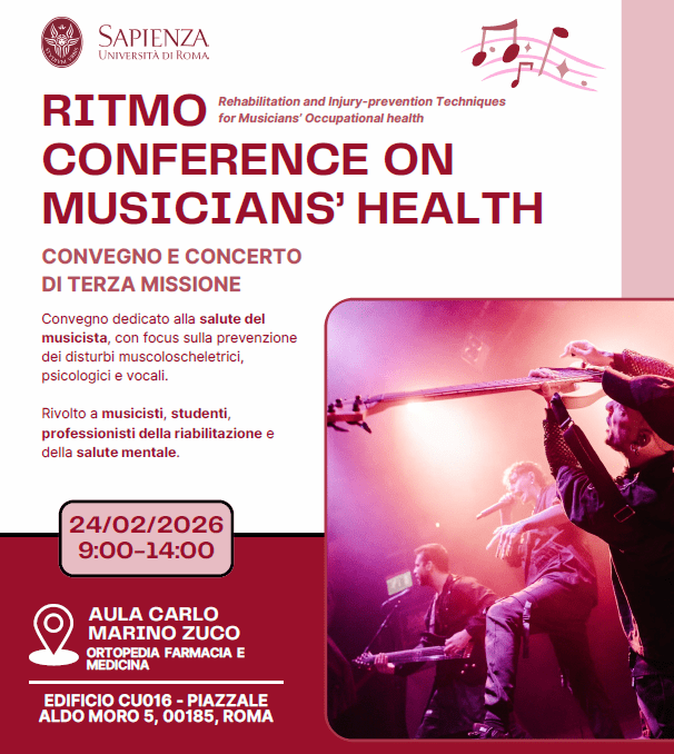 LV was recently invited to give a talk at the closure symposium for the ‘Rehabilitation and Injury-prevention Techniques for Musicians’ Occupational health’ (RITMO) project, which took place on February 24th 2026 at Sapienza Università di Roma (Italy). It was a pleasure to hear from experts in rehabilitation, physiotherapists and occupational therapists, neuropsychologists, as well as musicians.