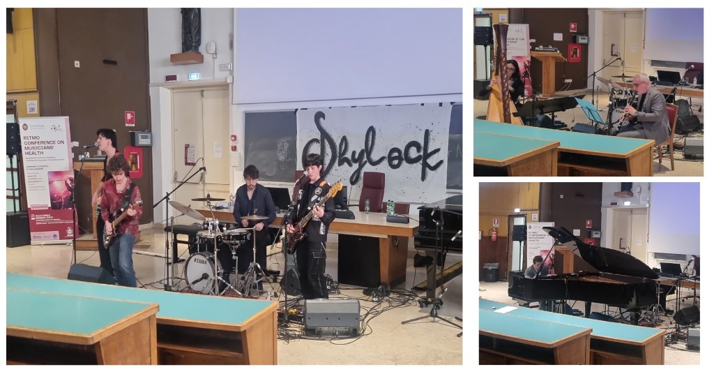 The musicinas playing at the RITMO symposium. From left to righ: the band Shylock; on the upper right: M. Castronovo & L. Iacobacci; on the bottom right: the pianist A. Idà. All photographed by LV during the event.